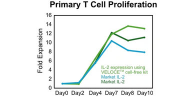 Using primary T-cell proliferation as the readout, IL-2 generated by our cell-free protein expression kit matched the potency of leading commercial IL-2.