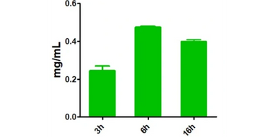 Expression of an VHH–GFP–His fusion protein rises quickly from ~0.25 mg/mL at 3 h to a peak of ~0.48 mg/mL at 6 h, with a modest decline by 16 h (~0.40 mg/mL). Bars show mean ± SD, indicating reproducible performance. These data highlight same-day production and suggest 6–8 h as an optimal harvest window for maximum yield (actual yields may vary by construct).