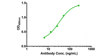 Dose–response ELISA (OD₄₅₀ vs antibody concentration, ~5–300 ng/mL) shows a classic sigmoidal curve with a plateau at higher concentrations, confirming that cell-free–expressed ranibizumab retains specific VEGF-A binding. The midpoint falls in the tens-of-ng/mL range (EC₅₀ depends on assay conditions such as coating density and buffers).